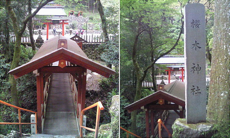 喜佐川を右手に暫く歩くと、右手前方に森が見えてくる。これが「桜木神社」だ。屋根付きの小さな橋を渡って境内に入る。