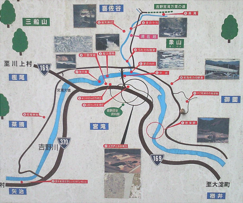 伊水道に達する。南への国道を下ると紀伊山地を越して熊野灘に達する。宮滝から道を北方向にとると飛鳥や奈良にいたる。