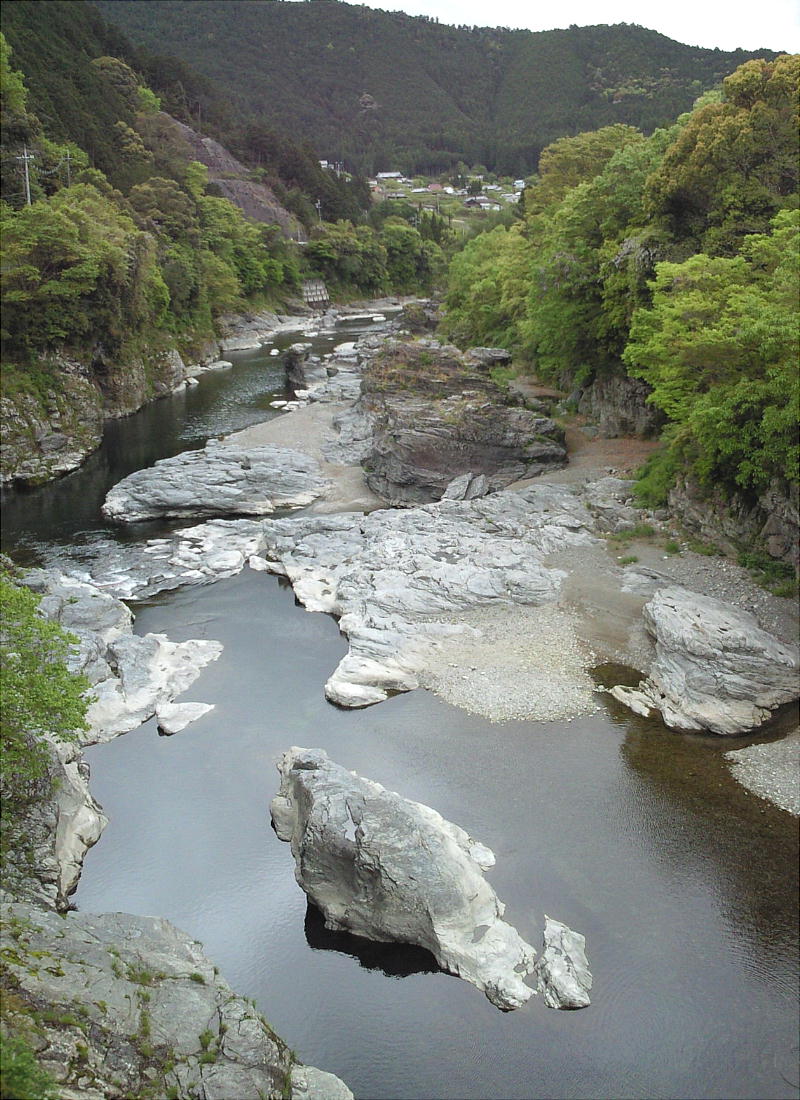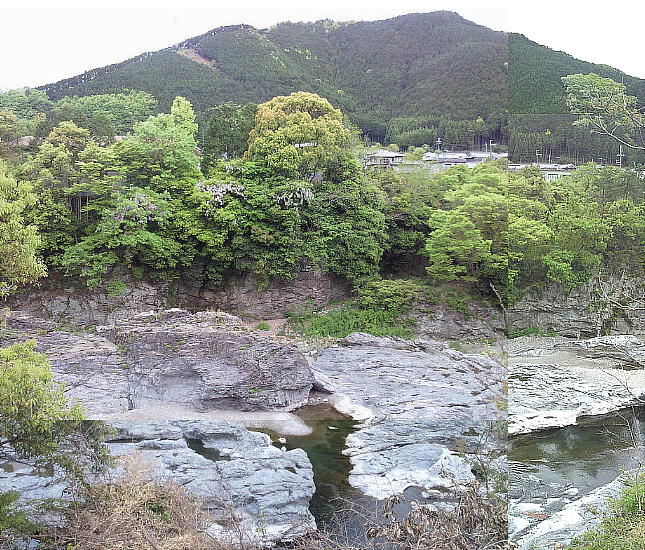 吉野離宮(宮滝遺跡)があった宮滝。川底から白い大きな岩が盛り上がる。水流は岩の間を流れているが、昔はもっと水量が多くて、