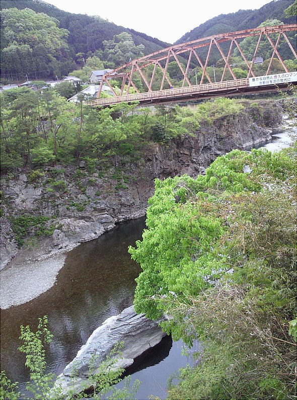「柴橋」の上から川面にキラキラ輝く日の光を眺めながら、しばし絶景を楽しむ。現在は上流にダムがあって水量が少ないが、