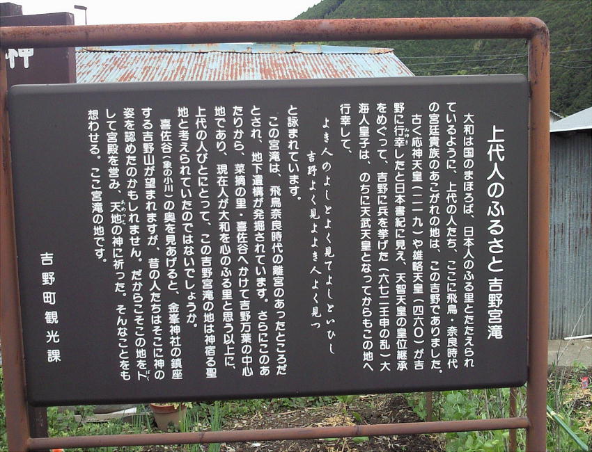 この広場から資料館へ上ってゆく道の辺りに、持統天皇が31回立ち寄ったとされる吉野離宮があったとされている。周辺は発掘