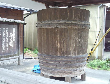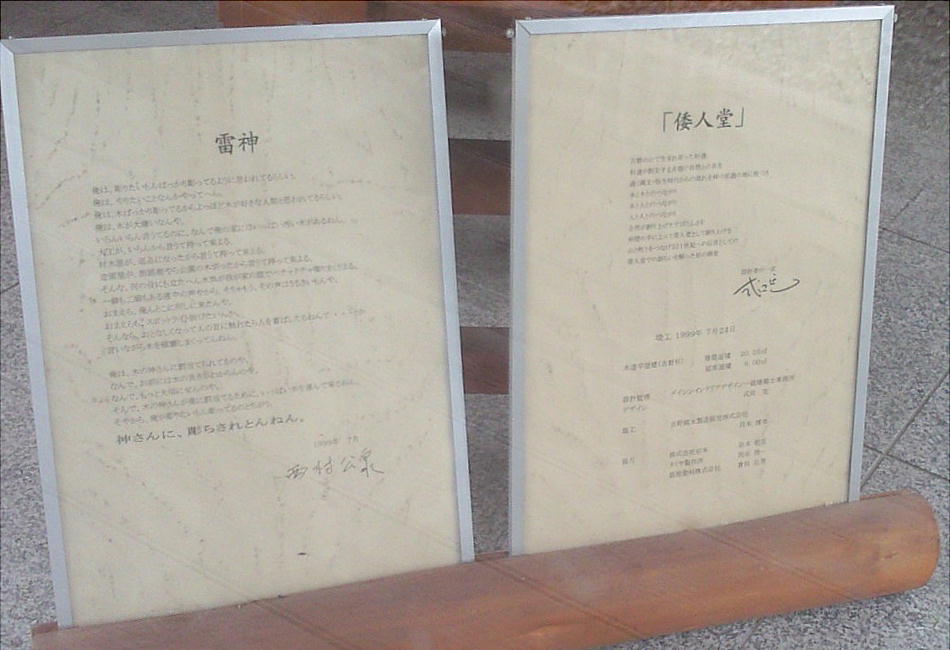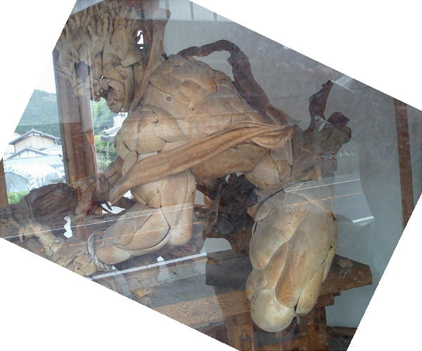 醤油屋さん、土産物屋さんの側になにやら建物があって、中にはオートバイに乗った「雷神」像が安置されていた。吉野杉を使っ