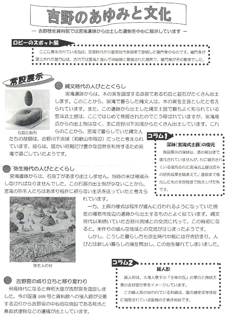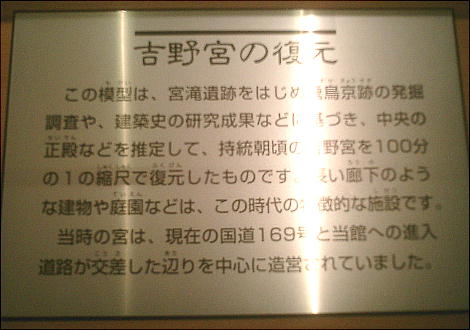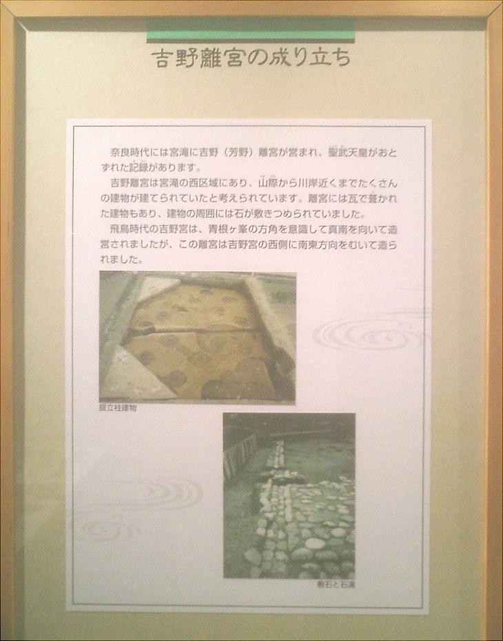 奈良時代には吉野宮の西側に吉野離宮が造営された。宮滝の美しい自然を愛でる宴が催され、多くの大宮人たちが訪れた。展示室