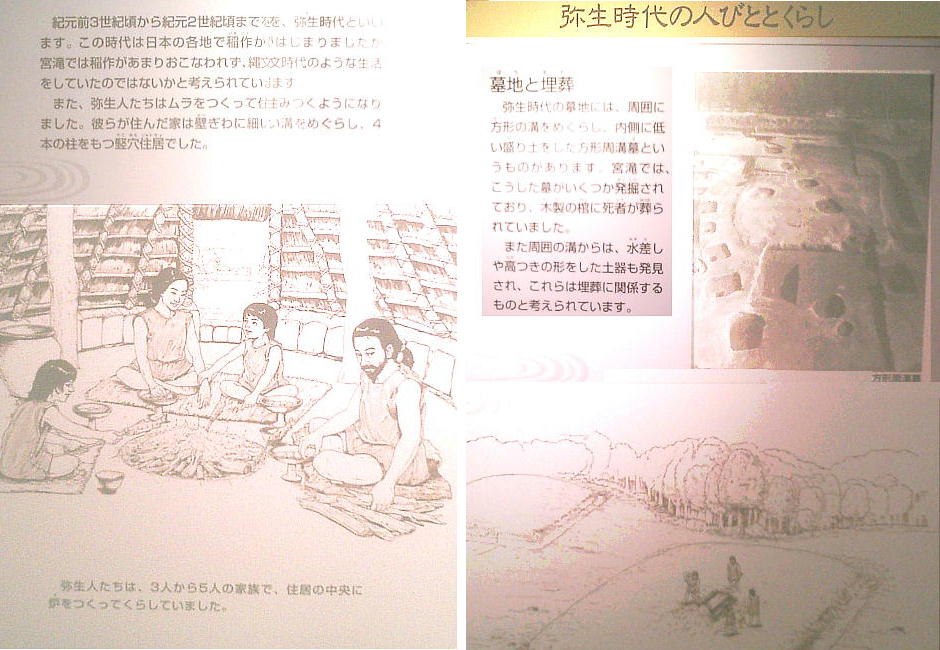 宮滝でムラをつくって生活しはじめた人びとは稲作にたよらない生活をしていた。遺跡からは竪穴住居や方形周溝墓の遺構や死者