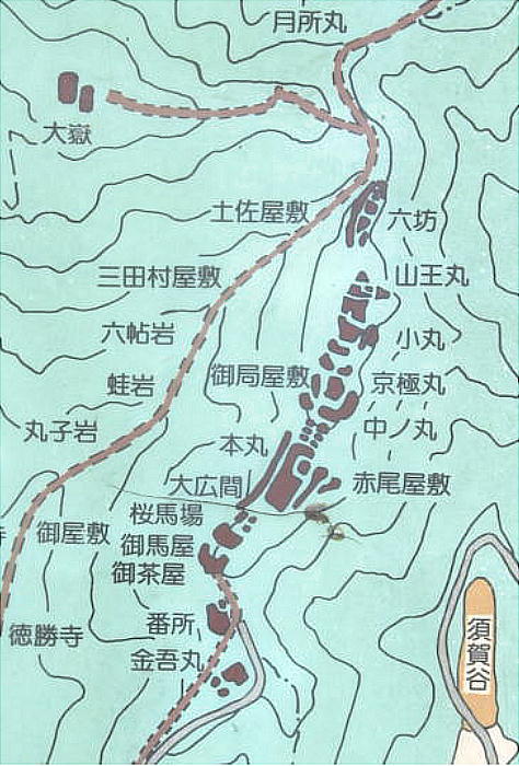 土や石のかこい)をつくる。尾根筋に沿って幾段もの曲輪が連なり、要所要所に掘割がつくられ、守りとなっている。恒久的な軍