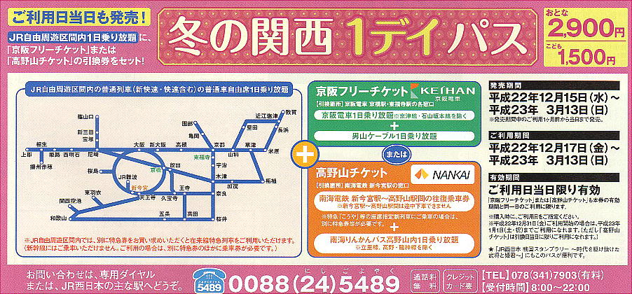杉本さんから教えて貰った「関西1デイパス」。大阪からだと河毛まで、片道2,200のJR交通費が往復で2,900円。このキップは、