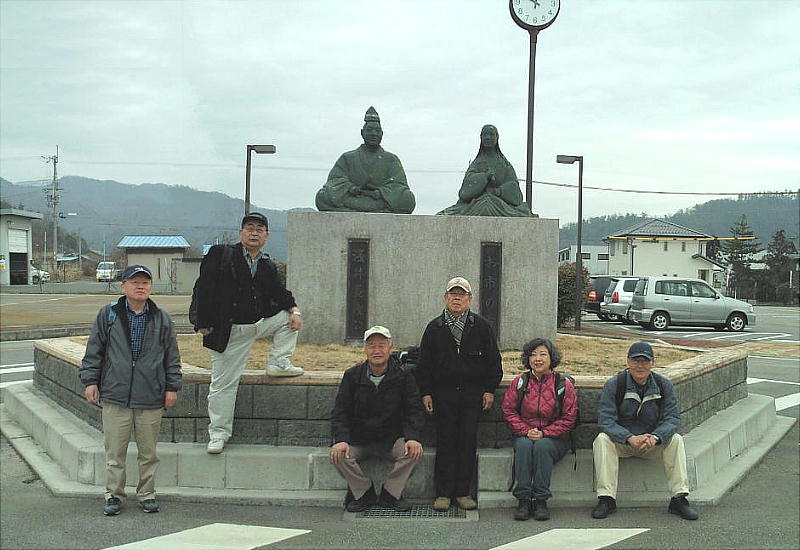 長政とお市の像の前で出発前の記念撮影。全員集合、世界へ発信!この写真も合成です。さて誰を追加したでしょう。わかるっかなぁ?
