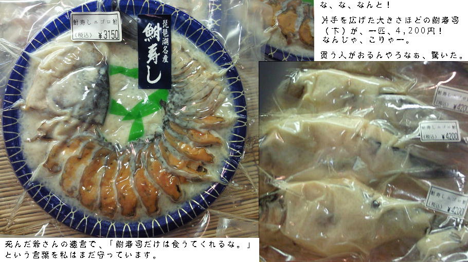 その隣にある鮒寿司屋で乾さんが鮒寿司を買うというのでみんなでついて行く。乾さん、鮒寿司が好きやったんかぁ、ゲゲェーッ。
