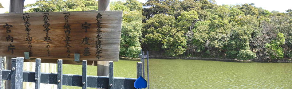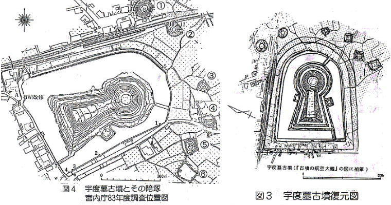 ある「陵墓参考地」である。周濠には満々と水を蓄え、堂々たる前方後円墳だ。周濠は盾形で外堤がめぐり、南側では浅い外堀の存在