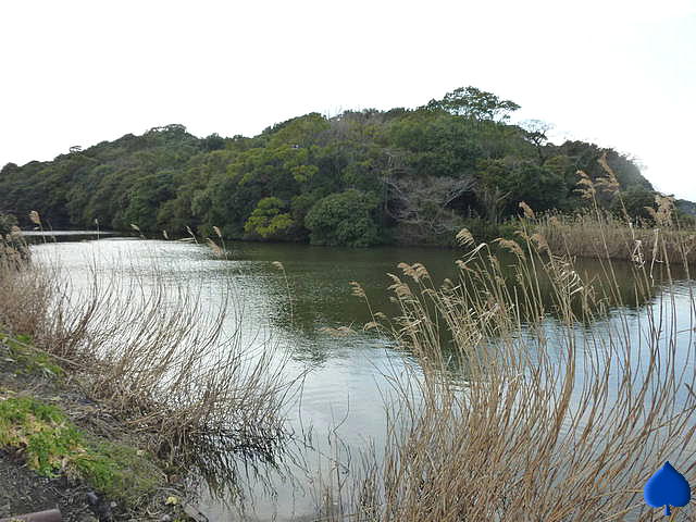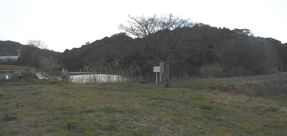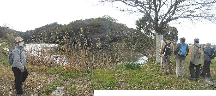 池の向こうの小高い山が真鍋山古墳である。そのずーっと右に白峠山古墳があるが、反省会を待ちきれないメンバーは「もう帰ろうよ」