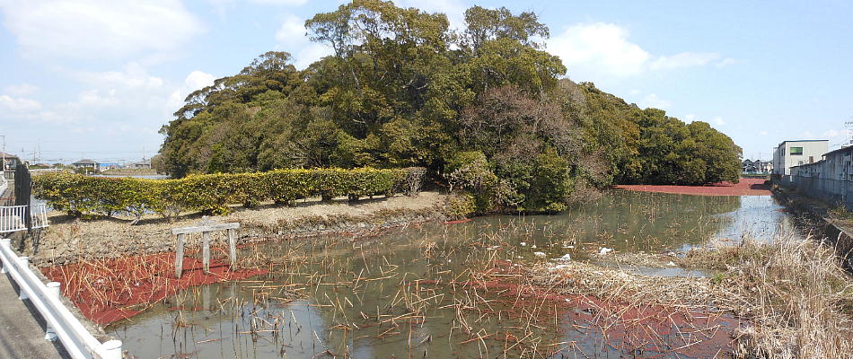 西側くびれ部に方形造りだしを持ち、周囲には盾形の周濠を持つが溜池と利用されてきたため現在では変形してしまっている。