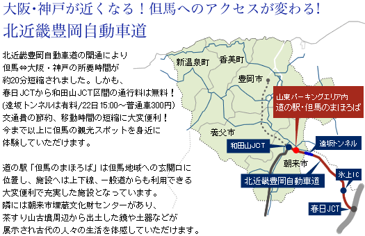 兵庫県朝来市・北近畿豊岡自動車道の山東PA「但馬のまほろば」という道の駅の中にある。朝来市内には北近畿豊岡自動車道の建設