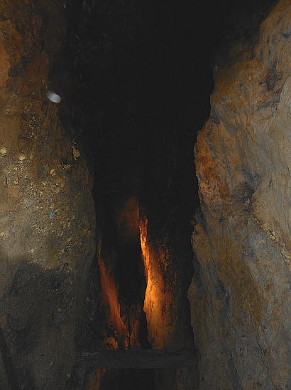 銀の鉱脈は磐の間を流れるように走っていて、その跡をたどって掘ってゆくため、このように深い隙間が幾つも出来る。危険。
