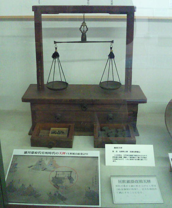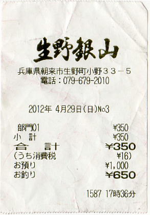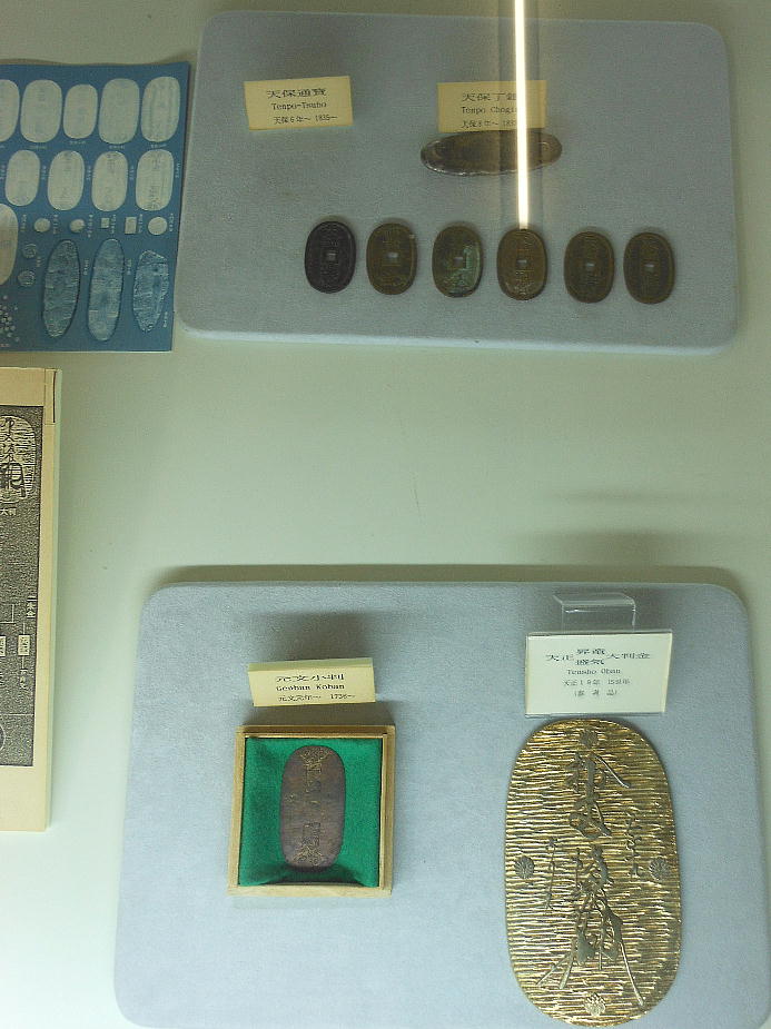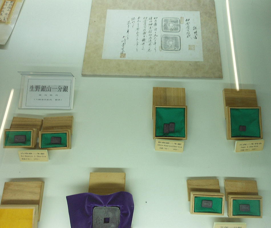 上右のレシートは、下右の小判レプリカの値段、350円。銀山で金小判とはこれいかに。下左は明治期の絵銭でこれは売価60,000円の本物。