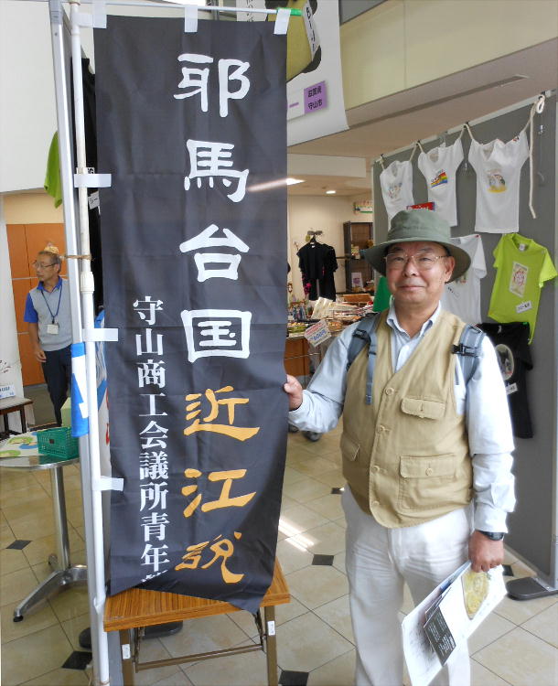 新聞に載っている「邪馬台国近江説」の幟(のぼり)が案内所にたててある。Tシャツは販売していないそうだ。