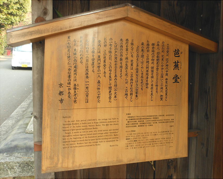 京都市東山区円山公園南。この堂は、江戸時代中期、俳聖松雄芭蕉をしのぶため、芭蕉にゆかりの深いこの地に加賀の俳人高桑蘭更が