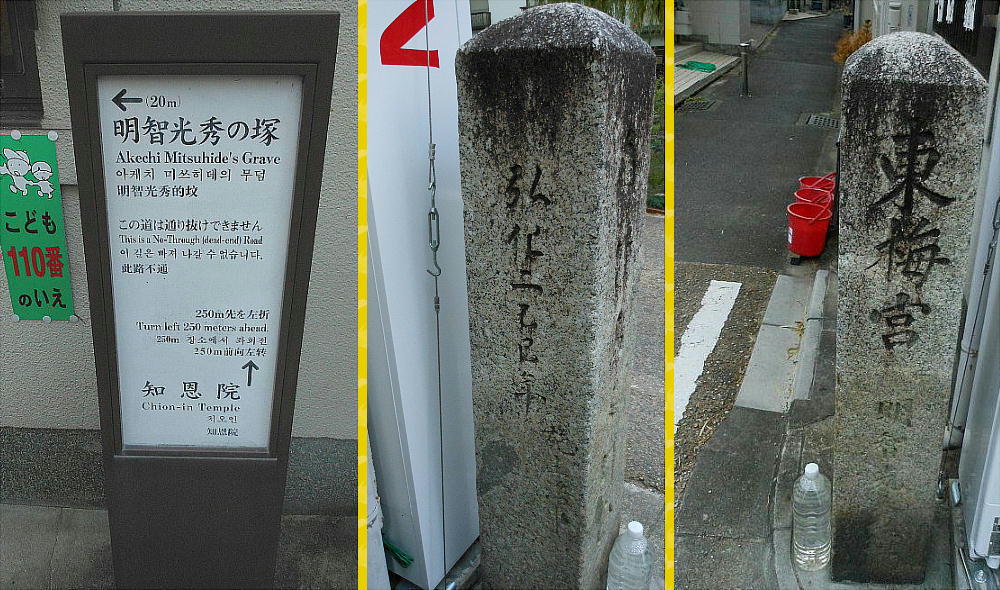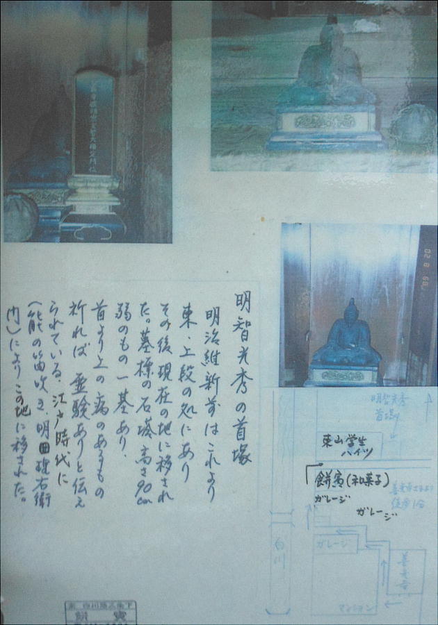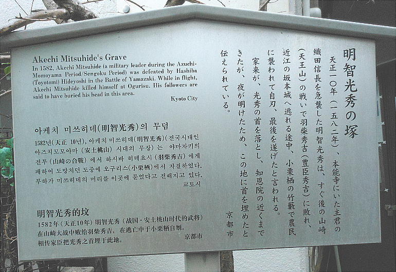 誌』によると、光秀の首は、粟田の刑場にさらされた後、そのすぐ近くの西小物座町の人家のうしろに、他の数千の首と一緒に埋めら