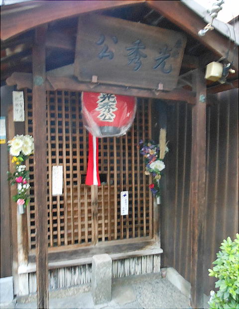 その路地の奥に、光秀の木像と位牌を祀った小祠を中心に、五輪塔の笠石を重ねた光秀の首塚、「長存寺殿明窓玄智大禅定門」(光秀
