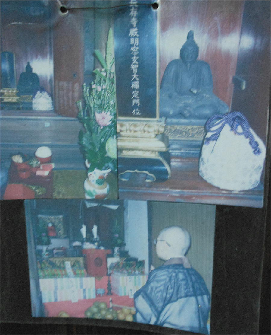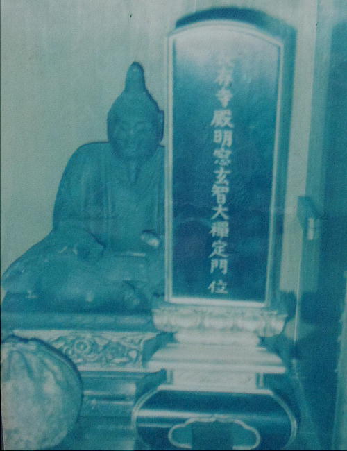 大禅定門」の石碑は、明治時代に光秀を演じた歌舞伎役者によって建立されたもの。光秀の木像は厨子の中に納められていて見ること