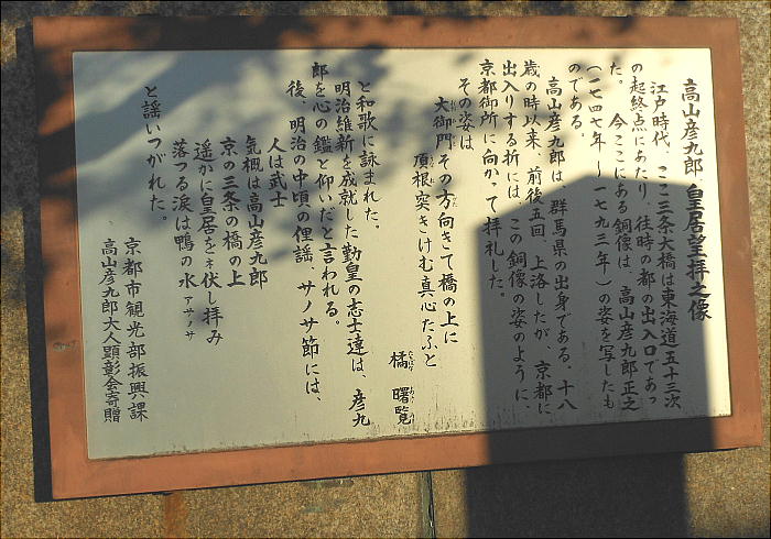 京阪三条駅そばにある「高山彦九郎」像。狂信的な尊皇家であった彦九郎は、京都へ入る時この場所で必ずひざまづき、御所方面を向