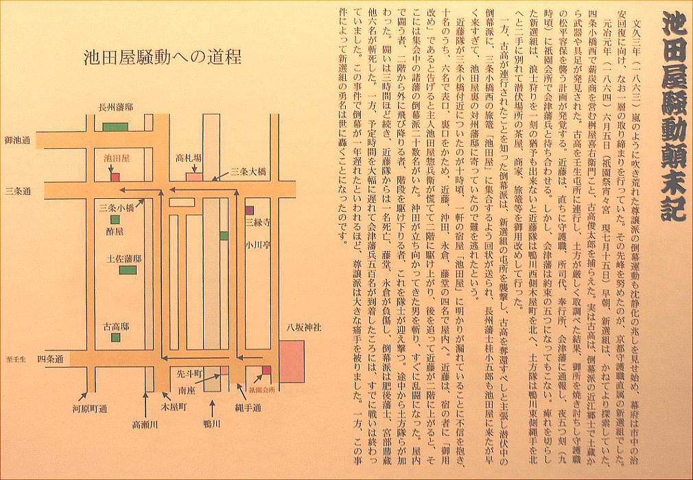 いた長州藩・土佐藩などの尊王攘夷派志士を、京都守護職配下の治安維持組織である新選組が襲撃した事件。池田屋騒動ともいわれてい