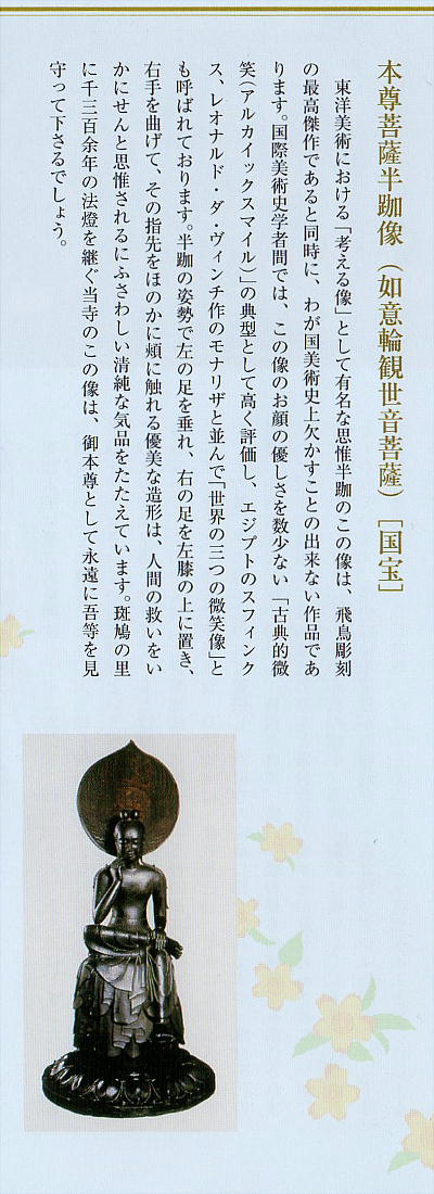 本尊。飛鳥時代の作。像高132.0cm(左脚を除く坐高は87.0cm)。広隆寺の弥勒菩薩半跏像とよく比較される。寺伝では如意輪観音