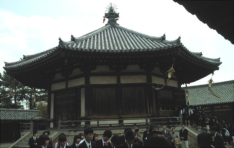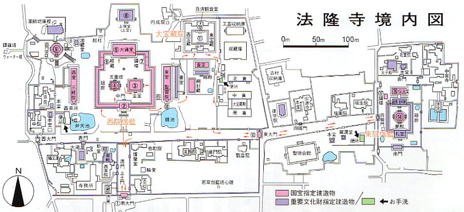 (国宝)と大講堂(国宝)をつないで回廊(国宝)が囲む。東に向かって東大門(国宝)を抜けたところに夢殿(国宝)のある東院