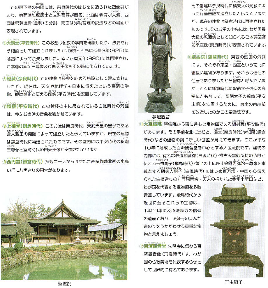 境内には、飛鳥時代をはじめとする各時代の粋を集めた建築物が軒をつらね、たくさんの宝物類が伝来している。