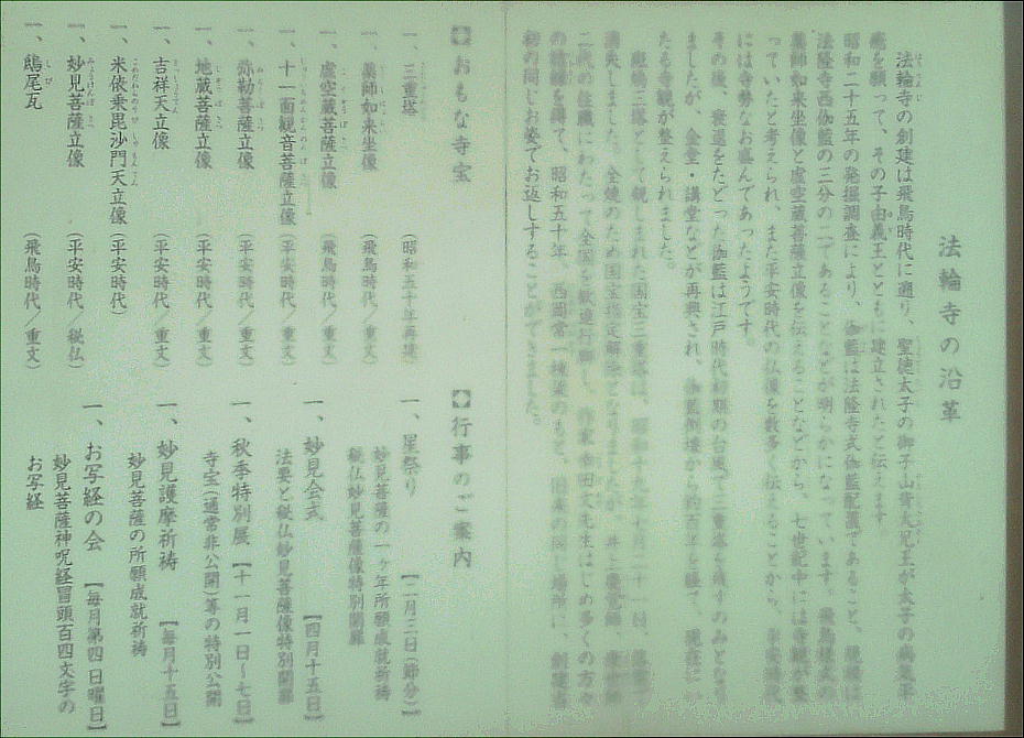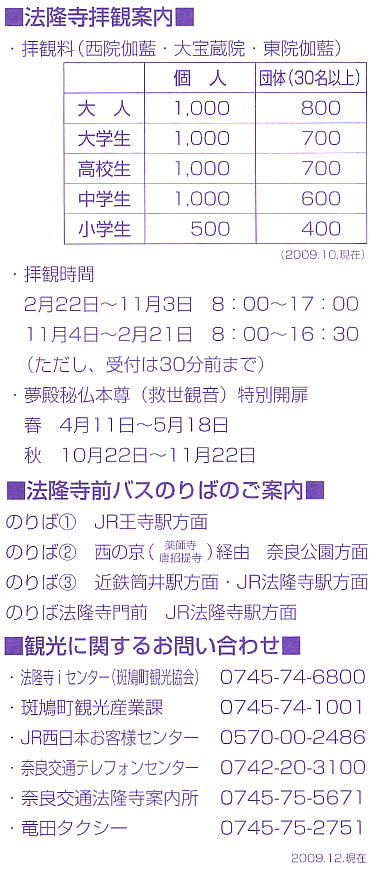 ・法隆寺(拝観料 1000円 夢殿を含む) 夢違観音、百済観音、釈迦三尊像など。なお、法隆寺には、多くの伎芸面が所蔵