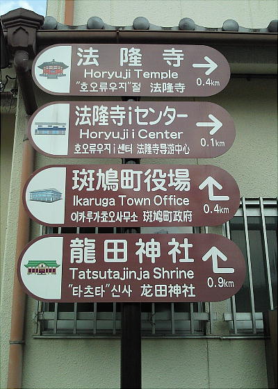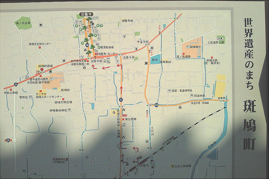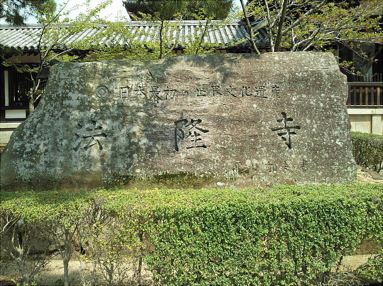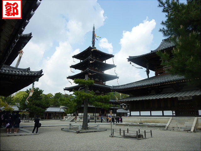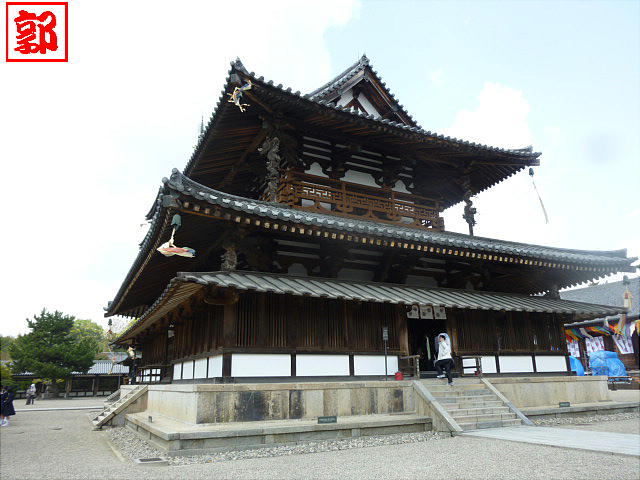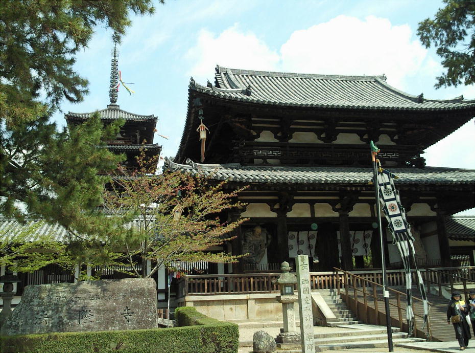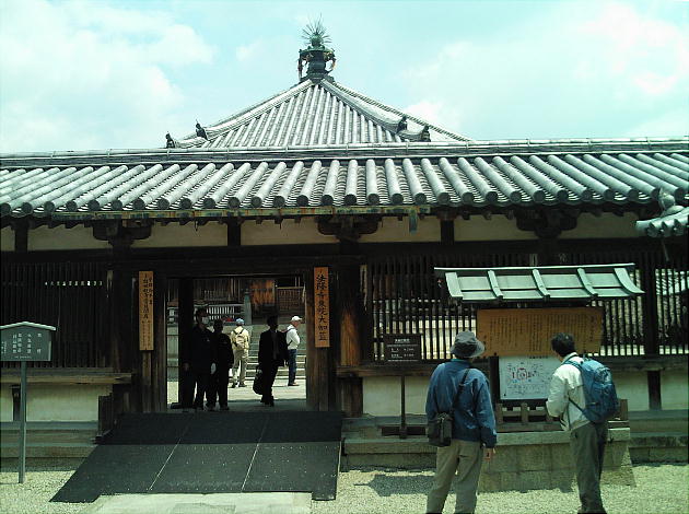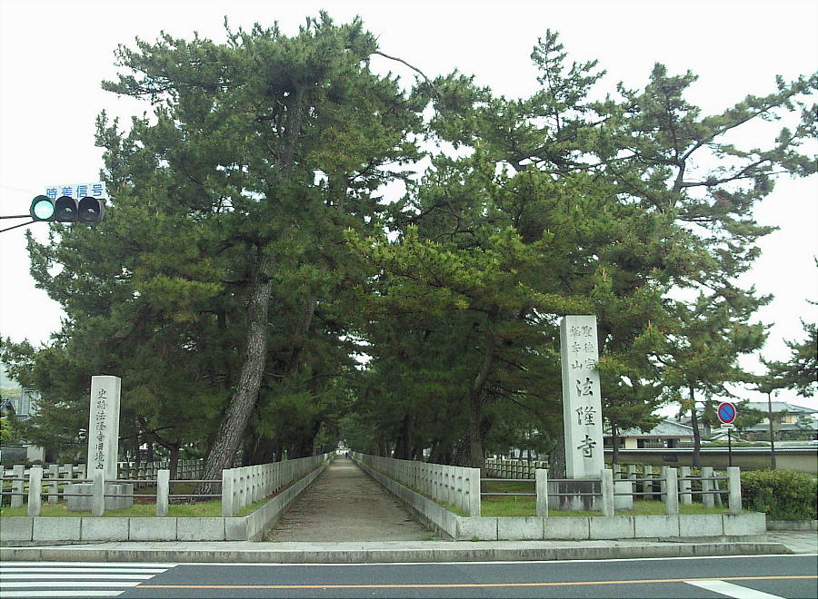 法隆寺への参道は松並木になっており、参道を抜けたところに南大門(国宝)がある。境内は西院と東院に大きく分かれ、国宝
