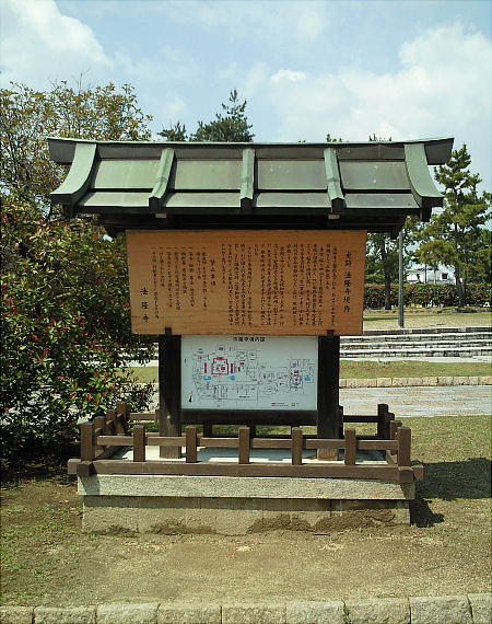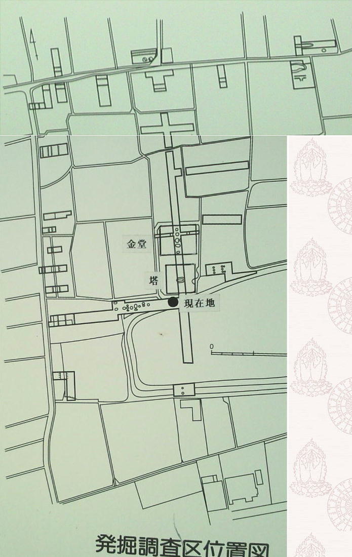 調査が行われ、金堂と塔の跡を検出。大阪の四天王寺と同様に、金堂を北、塔を南に並べる伽藍配置であったことがわかっている。
