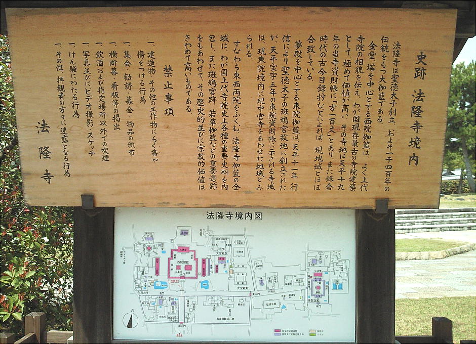 現在、法隆寺は塔・金堂を中心とする西院伽藍と、夢殿を中心とした東院伽藍に分けられている。広さ約18万7千平方メートルの