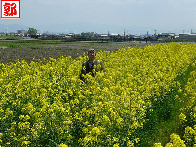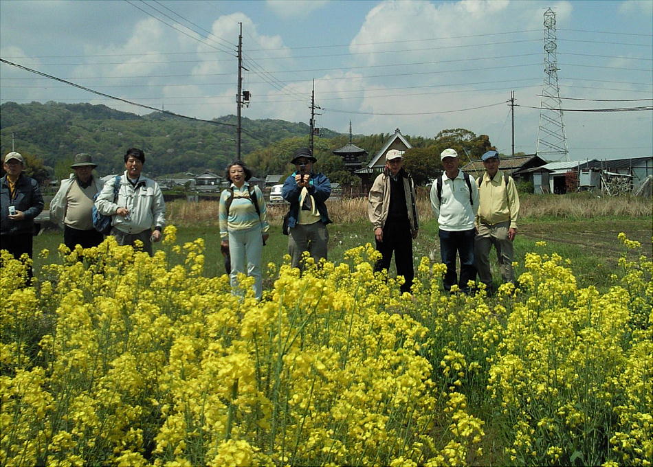 素晴らしい「菜の花畑」があったので、みんなで記念撮影。橋本さんのご要望で法輪寺の五重塔を入れたが小さい。