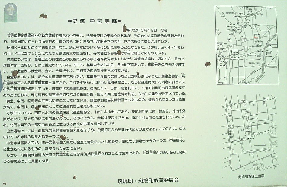 創建当時の中宮寺跡は現境内の東方約400メートル、斑鳩町法隆寺東二丁目にあり、国の史跡に指定されている。この地はかつての