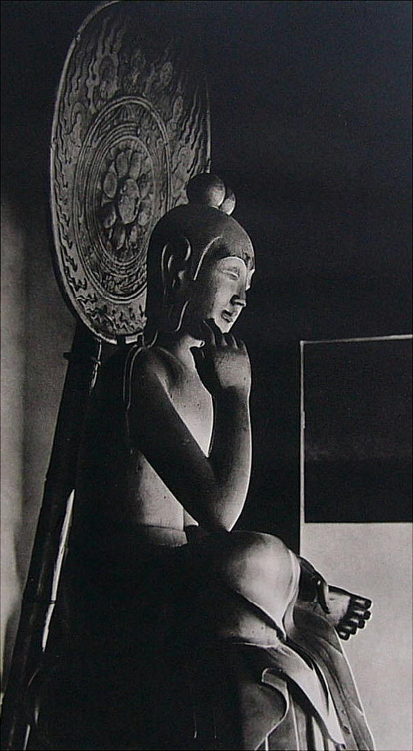 菩薩半跏像」である。材質はクスノキ材。一木造ではなく、頭部は前後2材、胴体の主要部は1材とし、これに両脚部を含む1材、台