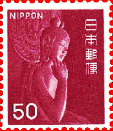 中宮寺の国宝、弥勒菩薩像(半跏思惟像)と、その普通切手(1966.12.26発行)