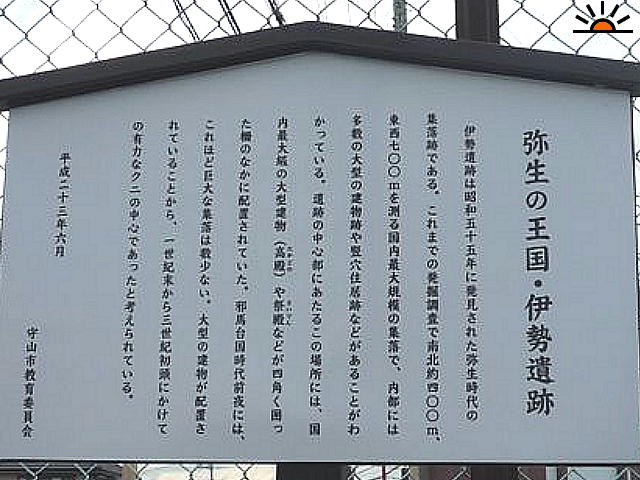 「邪馬台国近江説」は市内の伊勢遺跡が根拠で、この遺跡が邪馬台国と主張している。弥生時代後期(2世紀後半)の東西約700メ