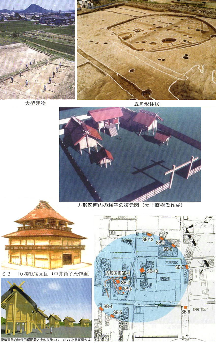 建物跡群の存在に集約される。南西に2基、北東に2基、そして最近の調査で北から3基の大型建物跡が出土しており、これらのことを
