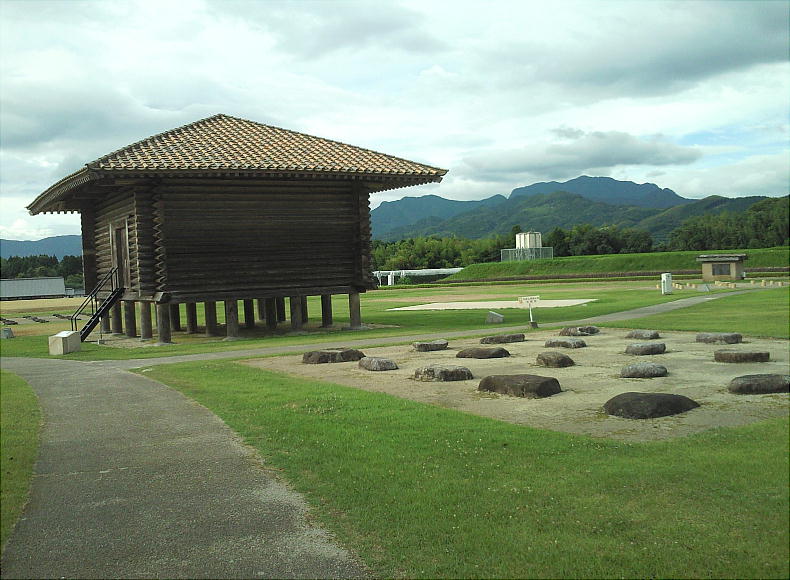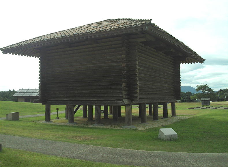 掘立柱建物跡に復元された高床式倉庫(柱のみ)。面積83.78u、屋根の高さ9.0m、床の高さ1.5m。建物の配置から、正史に記述さ
