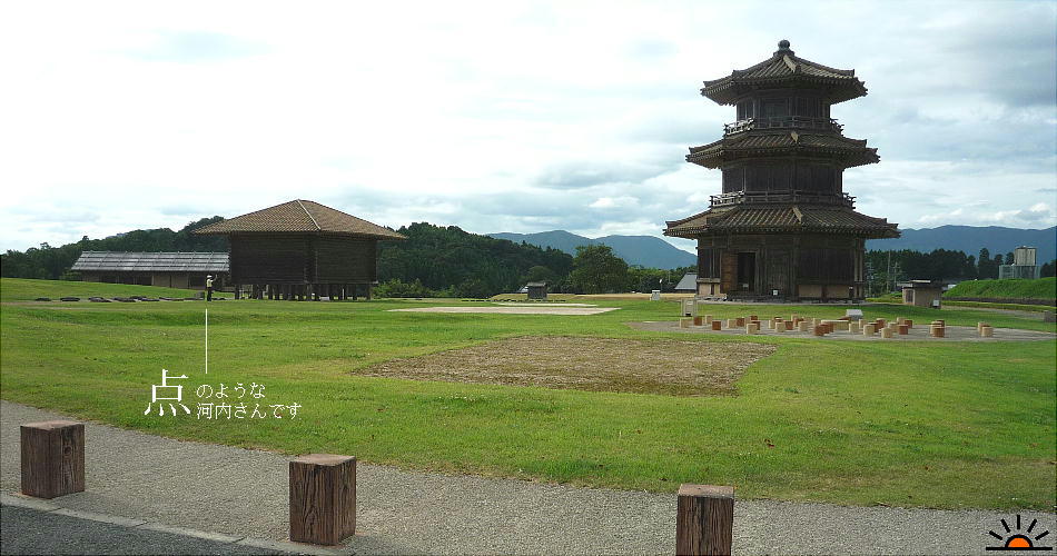 ...の部分で、西本さん?が立っておられる柱は、高床式倉庫跡ではなく、八角形鼓楼の柱の本来あった場所を示していますので、今、