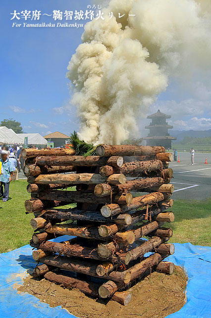 ど福岡、佐賀、熊本3県12カ所の経由地で、遠くに煙が見えた時点で順次点火していった。1時間後、約100キロ離れた鞠智城