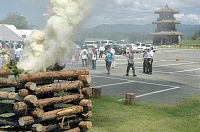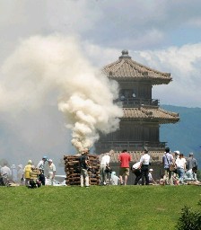 鞠智城跡の八角形鼓楼をバックに空高く白煙を上げる烽火=山鹿市菊鹿町
