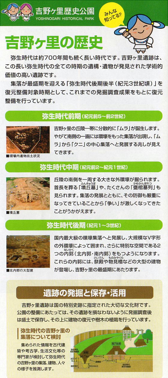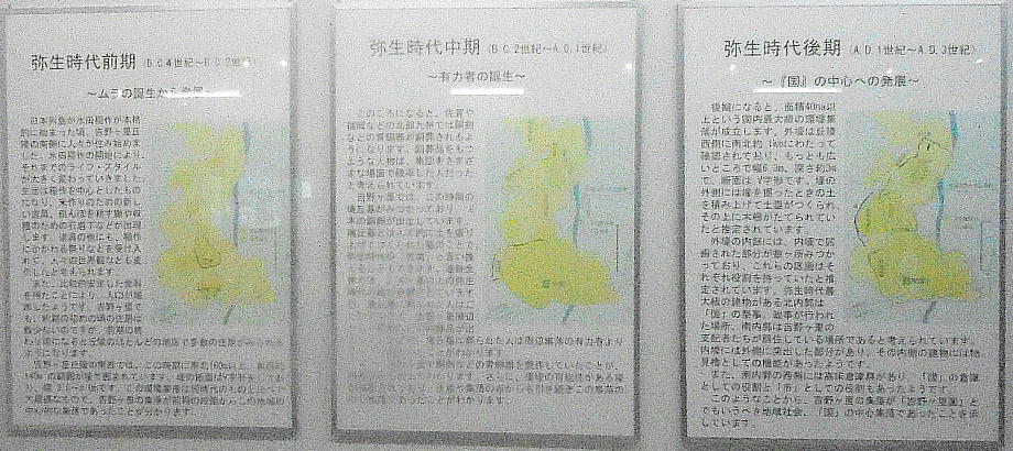 吉野ヶ里遺跡では、この長い弥生時代の全ての時期の遺構・遺物が発見されている。これらは日本の様子を記した最古の記録である魏志