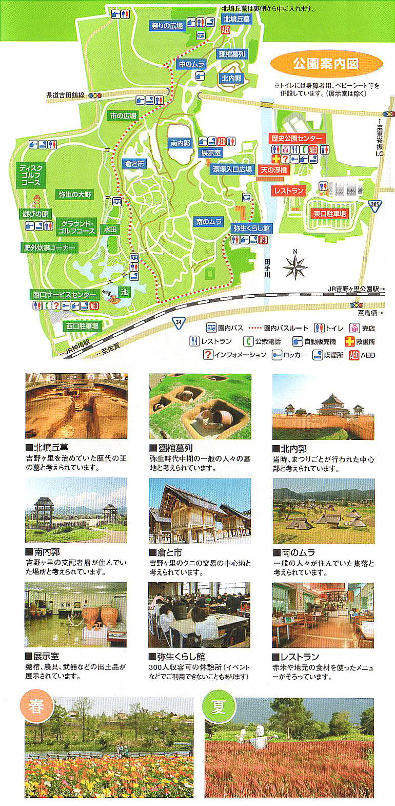 る柱坑や集会所跡、甕棺墓などが発見されたため、それらについても復元施設が建設されている。環濠や防御杭なども発見場所に復元さ