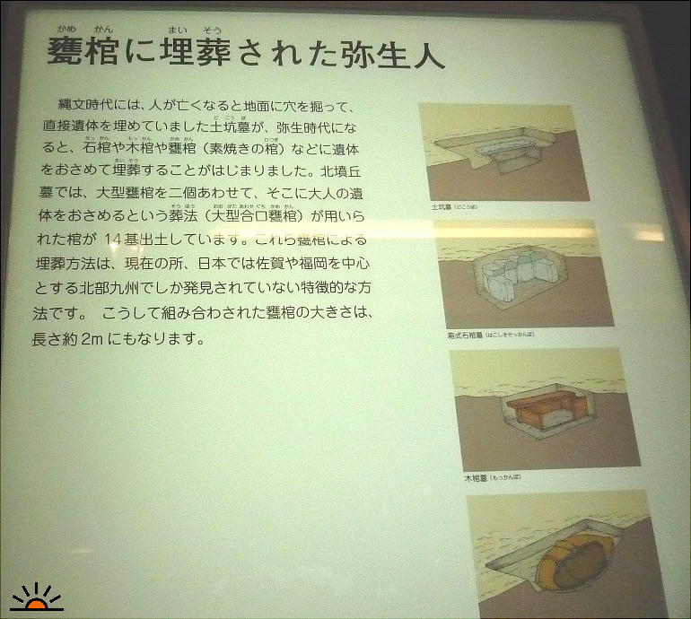 吉野ヶ里では、甕棺墓、土コウ墓、箱式石棺墓と様々な墓制が見られるが、一番多いのがこの甕棺墓である。二つの甕を合わせた中に、