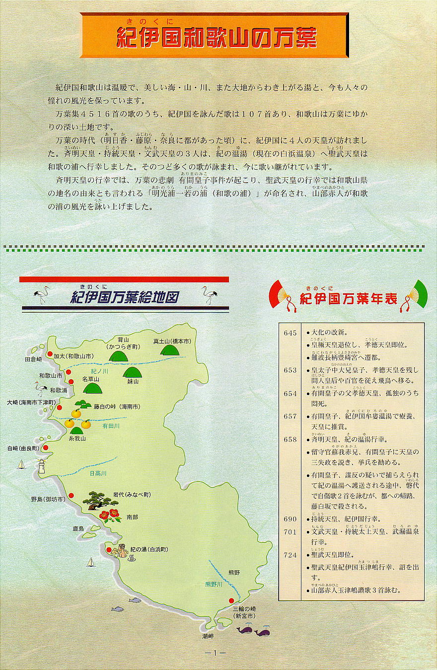 万葉集の中には和歌山を旅した歌が百七首あり、和歌浦を始め万葉和歌に詠まれた地名が今に伝わっている。数ある和歌山県内の万葉