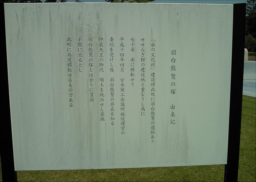 せらぎ館の正面近くに再度移転した。入館者の多くの人は、墓の前に書いてある約千六百年前の「羽白熊鷲の由来に