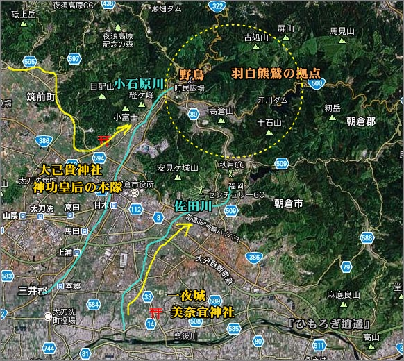 熊鷲の本拠地とされる荷特(に/のとり)を朝倉市秋月の野鳥と想定すれば、その支配領域は、もとの夜須郡、つま