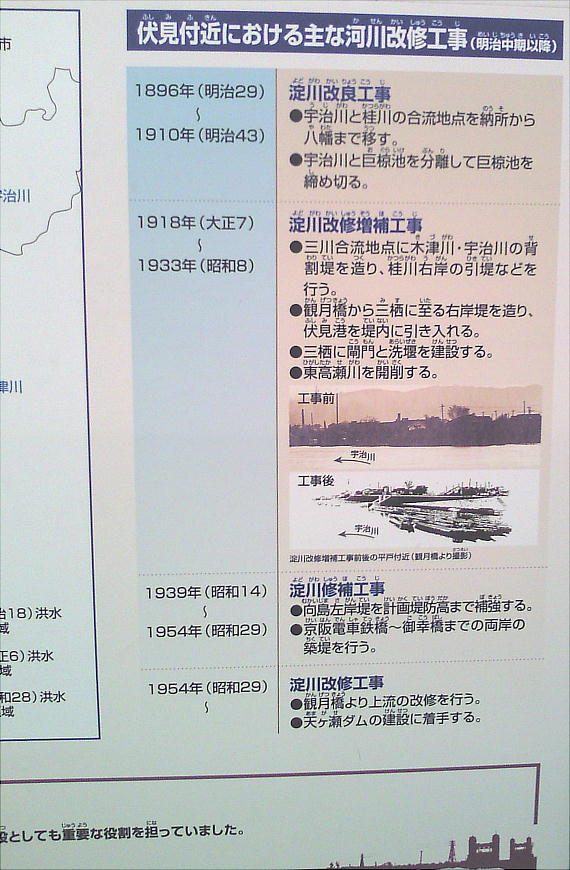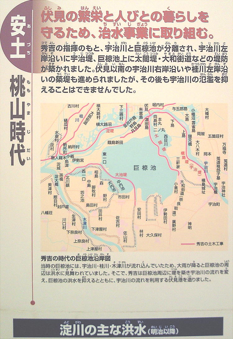 昔より、宇治川は氾濫を繰り返し、洪水の被害にあってきた。桃山時代には豊臣秀吉が伏見に城下町を築き、太閤堤の建設など