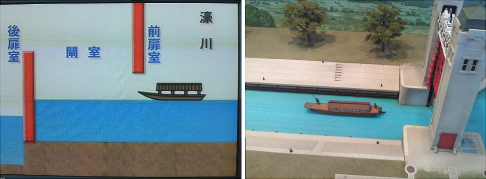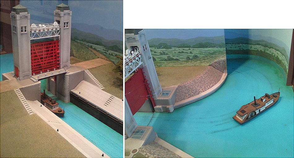 閘門の機能は、以下の模型を見ればすぐ理解できる。高低差のある水面間を船が往来するための、水門を開け閉めして、船を移